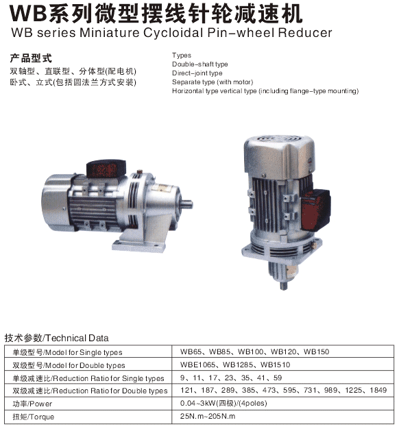 1、單級系列有WB65型、WB85型、WB100型、WB120型、WB150型。減速比分別有9、11、17、23、29、35、43、59、71、87。